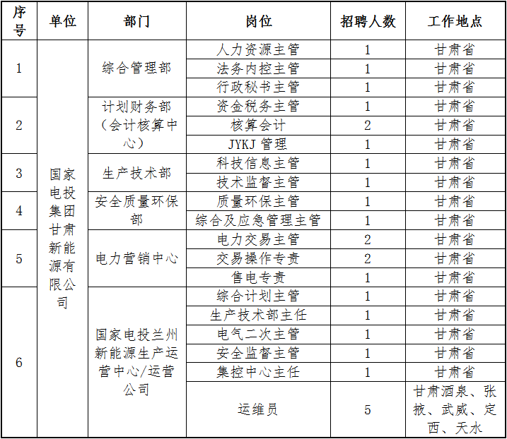國家電投集團(tuán)甘肅新能源有限公司(簡稱:國家電投甘肅新能源公司)成立于2016年,是國家電力投資集團(tuán)有限公司(簡稱:國家電投)在甘肅地區(qū)設(shè)立的新能源投資、開發(fā)、建設(shè)和運(yùn)營企業(yè),與國家電投甘肅分公司一體化運(yùn)作。國家電投甘肅分公司為國家電投二級單位,主要承擔(dān)所在地區(qū)區(qū)域規(guī)劃、政府對接、市場開發(fā)、電力營銷、品牌建設(shè)等工作。