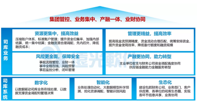 結(jié)合集團(tuán)企業(yè)發(fā)展需求和業(yè)界實(shí)踐經(jīng)驗(yàn),司庫管理體系建設(shè)需滿足“資源更集中、管理更精益、風(fēng)控更全面、產(chǎn)融更協(xié)同”四個(gè)標(biāo)準(zhǔn),以數(shù)字化、智能化的司庫管理信息系統(tǒng)為支撐,以“集團(tuán)管控、業(yè)務(wù)集中、產(chǎn)融一體、業(yè)務(wù)協(xié)同”為管理目標(biāo)。