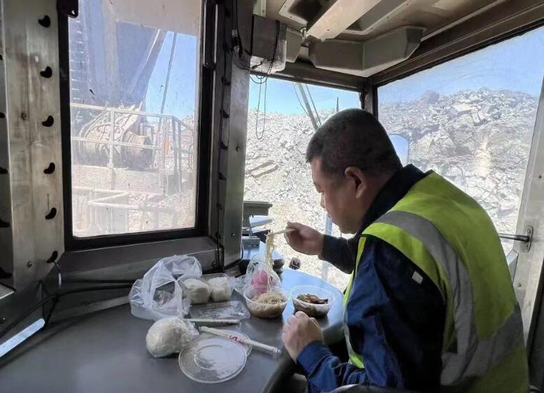 山西省朔州市中煤平朔集團(tuán)東露天礦,電鏟挖掘機(jī)駕駛室內(nèi),司機(jī)邢利平在作業(yè)間隙吃午飯。