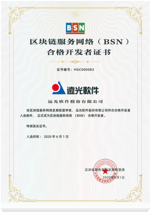近日,遠光軟件股份有限公司(SZ 002063)獲得了區(qū)塊鏈服務網絡發(fā)展聯(lián)盟授予的合格開發(fā)者證書,這標志著遠光軟件正式加入“國家隊”行列,成為國家級聯(lián)盟鏈區(qū)塊鏈服務網絡(BSN,Blockchain-based Service Network)合格開發(fā)者。