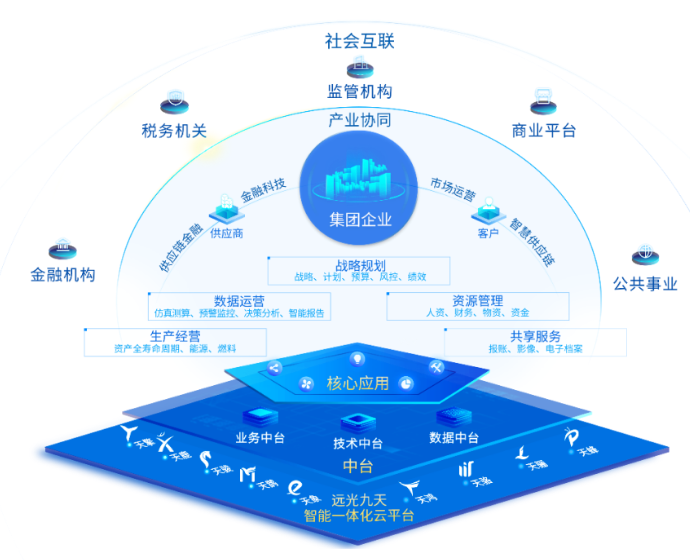 在傳統(tǒng)的企業(yè)內(nèi)部人力、物力、財力等資源要素管理基礎(chǔ)上,擴展戰(zhàn)略規(guī)劃、生產(chǎn)經(jīng)營、共享服務(wù)、數(shù)據(jù)運營等四個領(lǐng)域的核心應(yīng)用,將先進(jìn)數(shù)字技術(shù)與企業(yè)資源管理、業(yè)務(wù)運營深度融合,通過一套系統(tǒng)同時滿足企業(yè)不同層級、不同業(yè)務(wù)領(lǐng)域的數(shù)字化需求。同時,依托可擴展的平臺能力,共享基于先進(jìn)業(yè)務(wù)實踐沉淀的新業(yè)務(wù)、新理念管理模型,彈性支撐業(yè)務(wù)發(fā)展,為全業(yè)務(wù)進(jìn)行賦能。