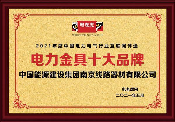 近日,中國能源建設(shè)集團南京線路器材有限公司參與了2021年度中國電力電氣行業(yè)“十大品牌”系列評選活動,榮獲“電力金具十大品牌”稱號。