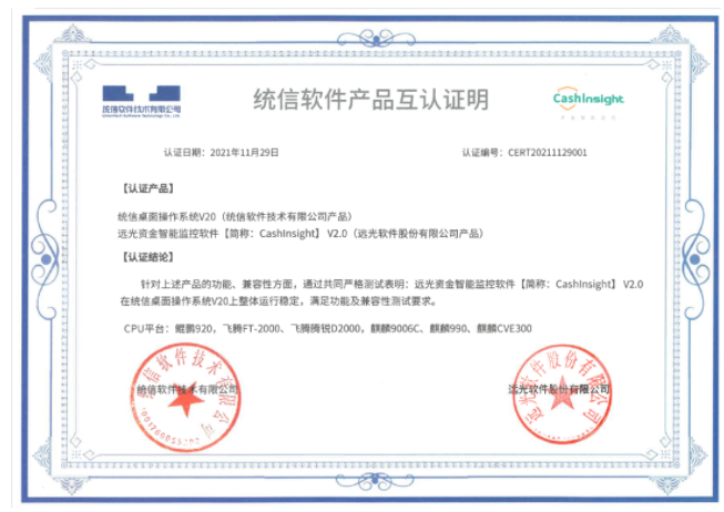 近日,遠光軟件自主研發(fā)的分析型軟件產(chǎn)品資金智能監(jiān)控軟件CashInsightV2.0與國產(chǎn)操作系統(tǒng)廠商統(tǒng)信軟件推出的統(tǒng)信桌面操作系統(tǒng)V20完成產(chǎn)品兼容互認證。測試結果表明,CashInsight V2.0在功能、兼容性方面整體運行穩(wěn)定,滿足認證要求。標志著遠光軟件在支持國產(chǎn)軟件兼容適配方面再下一城,支撐能力不斷加強。
