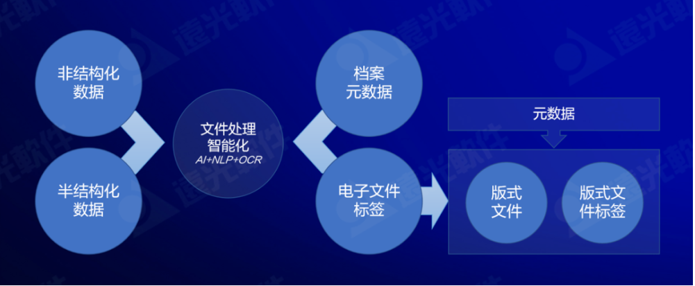 此外,還通過人工智能技術,賦予機器理解文檔的能力,自動從海量非結構化文檔中提取出結構化信息,生成檔案元數(shù)據(jù),給歸檔文件自動打標簽,提供檔案管理的多維信息,滿足電子檔案智能保管、高效利用的場景需求,實現(xiàn)歸檔文件的智能化處理。