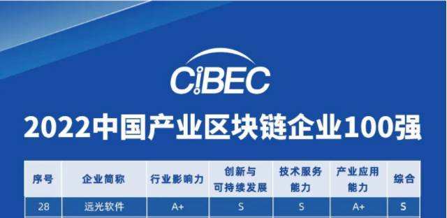 大會根據(jù)該調(diào)研結(jié)果發(fā)布了“2022中國產(chǎn)業(yè)區(qū)塊鏈企業(yè)100強”榜單。榜單評選基于調(diào)研企業(yè)2021年度全年相關(guān)數(shù)據(jù)統(tǒng)計分析與核查比對得出,評選指標(biāo)由行業(yè)影響力、創(chuàng)新與可持續(xù)發(fā)展、技術(shù)服務(wù)能力、產(chǎn)業(yè)應(yīng)用能力四個一級指標(biāo),19個細(xì)化統(tǒng)計指標(biāo)構(gòu)成。遠(yuǎn)光軟件從眾多候選企業(yè)中脫穎而出,以S級評分入選百強企業(yè)前列。