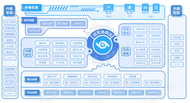 遠光協(xié)同云以移動端協(xié)同為核心,融合內(nèi)外部應用,支持企業(yè)以搭積木形式取用文化建設、溝通協(xié)作、綜合事務等多類應用,為企業(yè)構建社交化、移動化、云端化、智能化的協(xié)作創(chuàng)新生態(tài)圈。