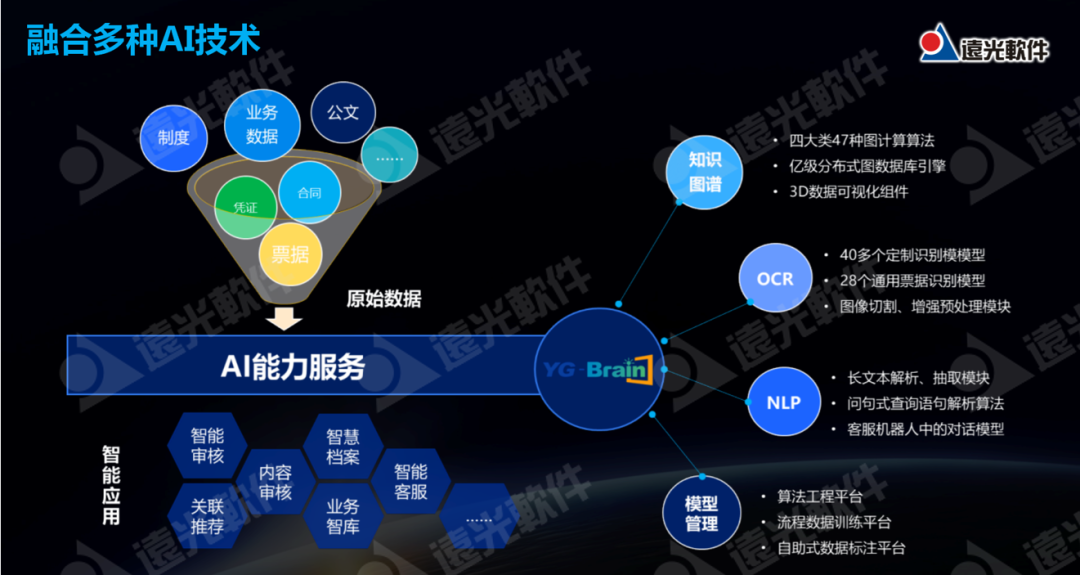 遠(yuǎn)光軟件積累了大量新型技術(shù)的開發(fā)能力,如大數(shù)據(jù)分析、AI、區(qū)塊鏈以及自主研發(fā)智能硬件的能力,通過YG-RPA云平臺(tái)作為連接器,與新型智能化技術(shù)進(jìn)行連接、集成,最終形成以RPA機(jī)器人為抓手的智能化解決方案。