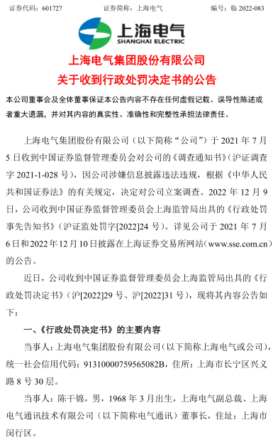 上海電氣12月25日晚間公告稱,近日,公司收到上海證監(jiān)局出具的《行政處罰決定書》,因未及時(shí)披露相關(guān)重大事件、2020年年報(bào)存在虛假記載,被警告并罰款500萬元;對(duì)上海電氣副總裁、電氣通訊董事長陳干錦給予警告,并處50萬元罰款。