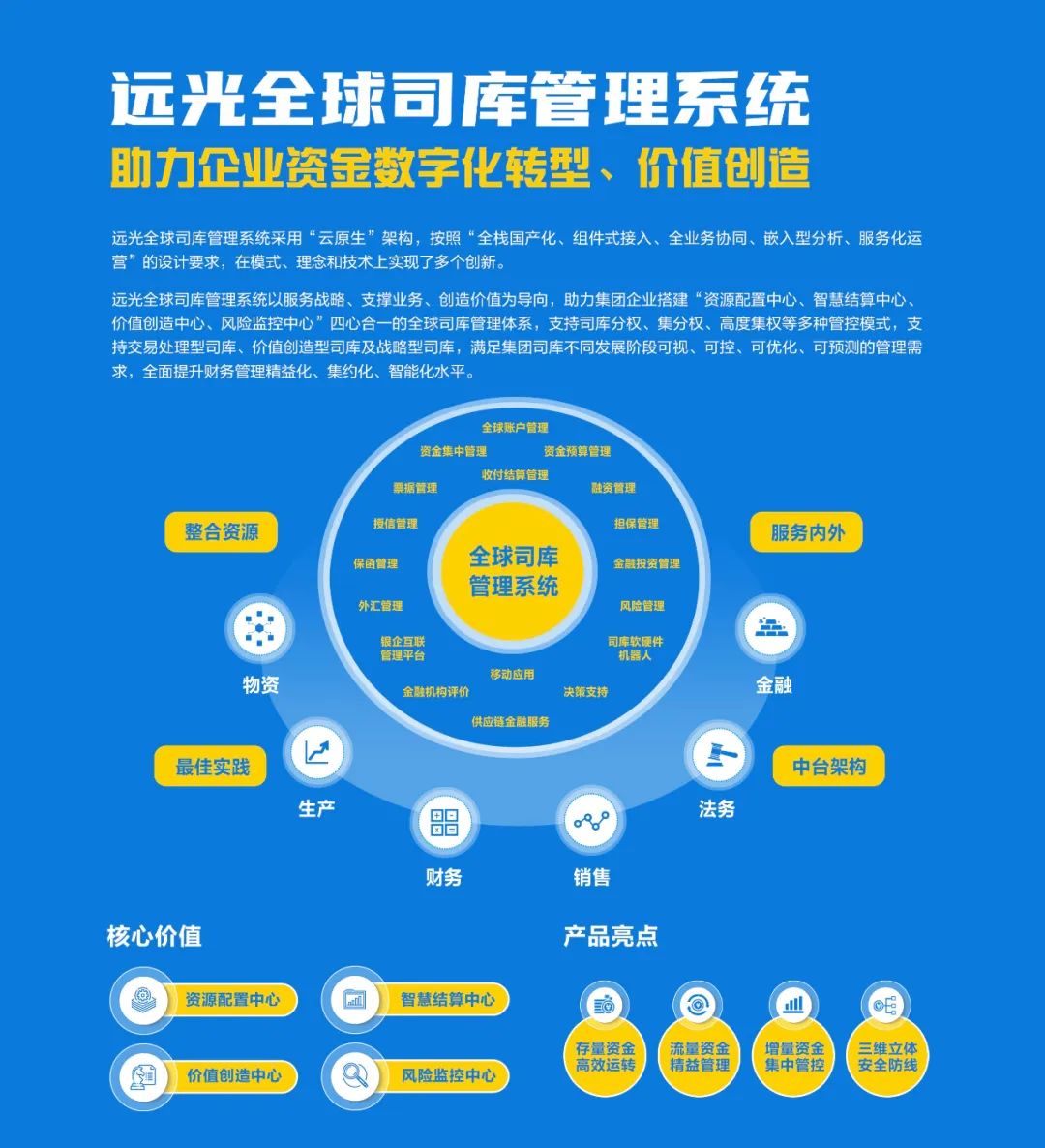 遠光全球司庫管理系統(tǒng)以“價值創(chuàng)造”為核心,以提高資金運營效率、降低資金成本、防控資金風(fēng)險為目標(biāo),滿足集團企業(yè)資金可視、可控、可優(yōu)、可預(yù)測四個不同發(fā)展階段的應(yīng)用需求,系統(tǒng)支撐全球賬戶及現(xiàn)金池管理、資金計劃管理、資金結(jié)算管理、融資管理、風(fēng)險管理、金融機構(gòu)關(guān)系管理、決策支持管理等業(yè)務(wù)應(yīng)用, 助力集團企業(yè)有效整合資源,管控風(fēng)險,實現(xiàn)資源配置效率的最大化。