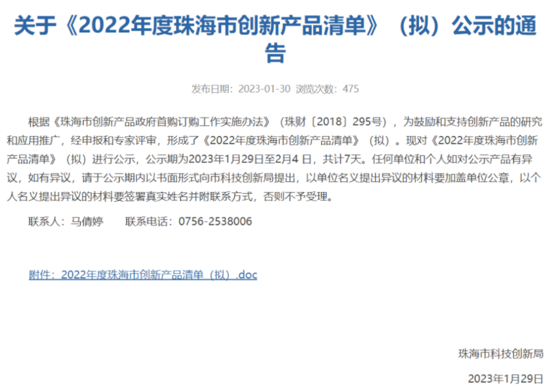 《2022年度珠海市創(chuàng)新產(chǎn)品清單》,是根據(jù)《珠海市創(chuàng)新產(chǎn)品政府首購訂購工作實施辦法》(珠財〔2018〕295號),經(jīng)企業(yè)申報和專家評審而來,旨在為鼓勵和支持創(chuàng)新產(chǎn)品的研究和應(yīng)用推廣。