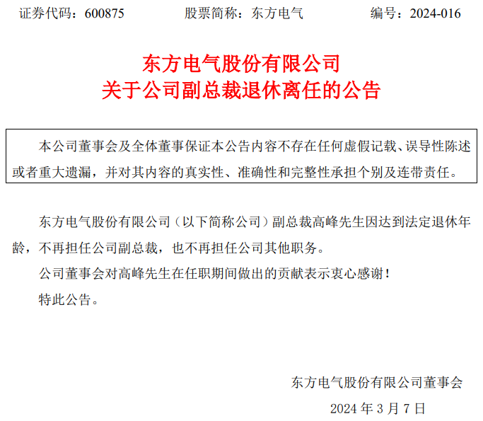 3月7日晚間,東方電氣股份有限公司(簡稱:東方電氣)發(fā)布關于公司副總裁退休離任的公告。