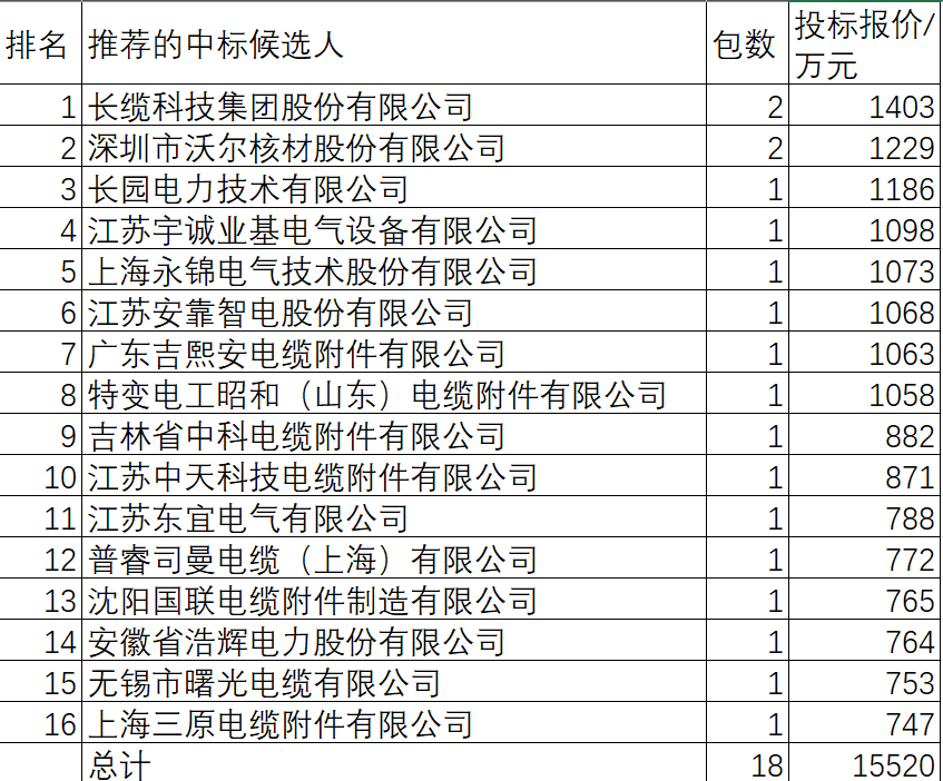 根據(jù)此前(2024年3月7日)推薦的中標(biāo)候選人公示,共招18包15520萬元,16家供應(yīng)商中標(biāo)。長(zhǎng)纜科技、沃爾核材中標(biāo)2包,其余供應(yīng)商中標(biāo)1包。中標(biāo)金額分布較為均衡,10家過800萬元,8家過1000萬元,長(zhǎng)纜科技最高,1403萬元,三原電纜附件最低,747萬元。