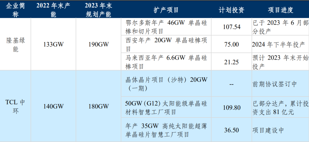 硅片雙龍頭擴(kuò)產(chǎn)情況;來源:公司公告