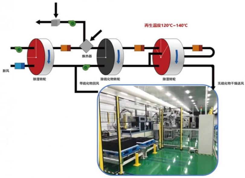適合于大風(fēng)量并且超級(jí)節(jié)能的固態(tài)電池工廠,采用多級(jí)除濕轉(zhuǎn)輪的方案,再生溫度低,70-90℃,適配低品位熱源,為超級(jí)節(jié)能系統(tǒng)。