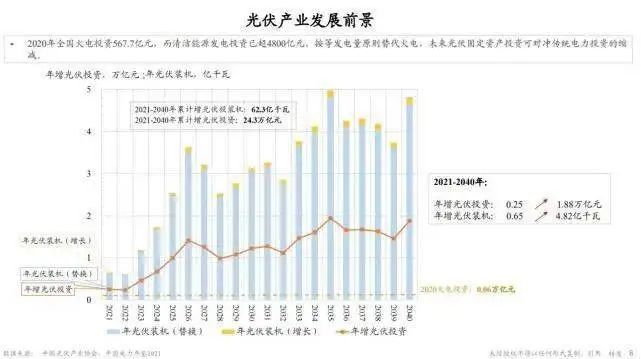 按照剛才的演進(jìn)路徑,光伏產(chǎn)業(yè)投資假如從2021年開始,新增的電源都是由光伏裝機(jī)來實(shí)現(xiàn),那么下面這張圖就展示了未來的20年的一個(gè)投資逐漸增加的過程,從開始大概0.25萬億,到后來大概2萬億的年投資,整個(gè)全過程完成約20年,總共的投資規(guī)模大概是20多萬億元。