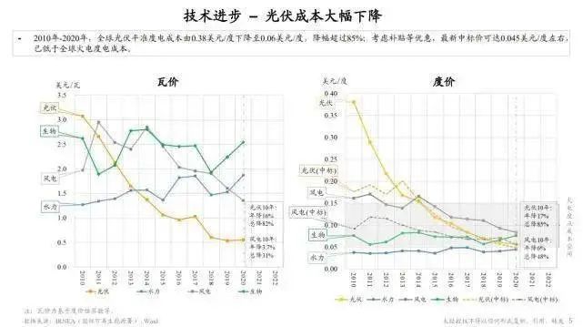 再看新優(yōu)勢(shì),就是技術(shù)進(jìn)步使得光伏成本大幅下降。在過去的十年,光伏的度電價(jià)格降幅超過85%。左圖中每瓦的光伏裝機(jī)的價(jià)格有一個(gè)很大的降幅,然后看右圖中光伏每度電的價(jià)格也有了大幅度下降,這也是在幾種不同的可再生能源類別中成本降幅最快的,這樣的話就大大提升了光伏的經(jīng)濟(jì)可行性。