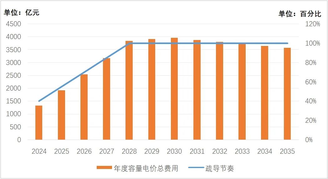 圖2 年度容量電價總費(fèi)用及疏導(dǎo)節(jié)奏(按趨勢預(yù)估測算)