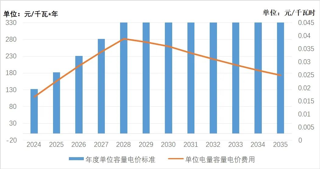 圖3 年度單位容量電價標(biāo)準(zhǔn)及單位電量容量電價費(fèi)用(按趨勢預(yù)估測算)