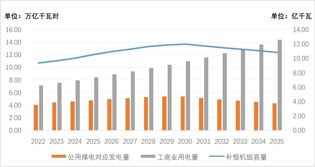 圖1 公用煤電對應(yīng)發(fā)電量及工商業(yè)用電量、補(bǔ)償機(jī)組容量預(yù)測趨勢(未來年度數(shù)據(jù)為作者個人分析預(yù)測值,其中煤電容量數(shù)據(jù)為年內(nèi)平均值而非期末時點(diǎn)值)