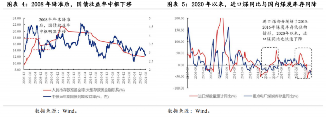 2020年以來,進口煤數(shù)量與國內(nèi)煤炭庫存同降,煤炭價格上漲持續(xù)時間可能比第二輪更長。2015-2016年,雖然國內(nèi)煤炭庫存同比處于低位,但進口煤數(shù)量同比持續(xù)攀升,可能部分彌補了國內(nèi)煤炭的數(shù)量。而2020年以來,進口煤炭數(shù)量與國內(nèi)煤炭庫存同步下滑,并且下滑的幅度要高于2015-2016年,疊加碳中和的長期政策,國內(nèi)煤炭價格上漲的持續(xù)時間可能比第二輪更長。