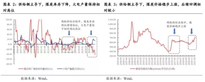 庫存同比低位+火電產(chǎn)量同比相對高位是煤炭價格和煤炭股啟動信號。2016年的煤炭股行情與今年都是在供給側(cè)壓縮下主導(dǎo),在兩輪行情的起步階段,煤炭庫存同比均已經(jīng)過一段時間的下滑,與此同時,火電產(chǎn)量同比保持在相對高位,如圖2中火電產(chǎn)量同比始終高于煤炭庫存同比。在供給側(cè)主導(dǎo)的行情中,煤炭價格穩(wěn)步上漲,煤炭股與煤炭價格的啟動時間同比,煤炭價格保持在相對高位,煤價后續(xù)回調(diào)的幅度較小,例如供給側(cè)改革后的2018年11月至2020年5月,煤炭價格下跌幅度不足10%。