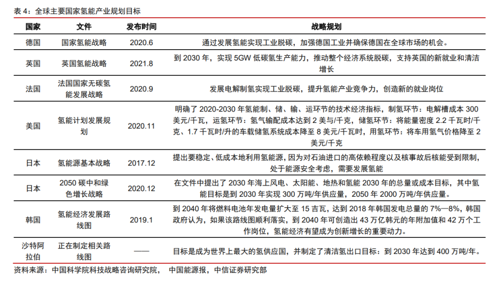 全球氫能發(fā)展相對(duì)領(lǐng)先的地區(qū)有美國(guó)、歐洲、日韓,而沙特阿拉伯、阿聯(lián)酋等中東國(guó)家也瞄準(zhǔn)了氫能,沙特阿拉伯雖未發(fā)表書面文件,但是已經(jīng)提出了氫能戰(zhàn)略目標(biāo)。