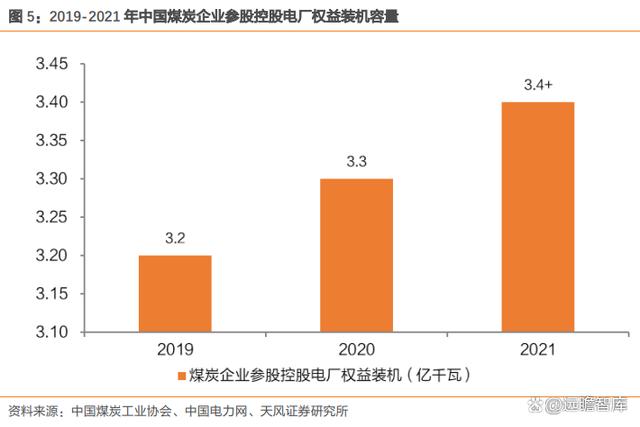 煤電聯(lián)營持續(xù)推進,2021 年底煤炭企業(yè)參股控股電廠權(quán)益裝機容量超過 3.4 億千瓦,比2015 年增加 1.9 億千瓦,占全國燃煤電力裝機的 30.6%。