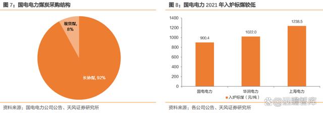 此外,上市公司國電電力充分利用集團優(yōu)勢,長協(xié)煤占比高,有效緩解燃料成本壓力。公司充分利用國家能源集團“煤電路港航”一體化產(chǎn)業(yè)協(xié)同優(yōu)勢,提升內(nèi)部優(yōu)質(zhì)長協(xié)煤炭資源比例及兌現(xiàn)率。2021 年,公司共采購煤炭 1.91 億噸,其中長協(xié)煤總量 1.75 億噸,占比92%。公司把握采購結(jié)構(gòu)和節(jié)奏,優(yōu)化采購煤種和熱值,深入開展精細(xì)化配煤摻燒;在燃料智能化、智能發(fā)電、電力安全生產(chǎn)標(biāo)準(zhǔn)化等方面,開展了很多前沿探索,積累了很多成果經(jīng)驗,管控水平行業(yè)領(lǐng)先。從 2021 年入爐標(biāo)煤來看,公司僅為 900.4 元/噸,明顯處于行業(yè)較低水平。