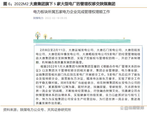 ? 大唐集團:2022M2 將旗下信陽、信陽華豫、略陽、運城、石門 5 家大型電廠的管理權(quán)移交給陜煤集團,實現(xiàn)控股權(quán)與管理權(quán)的統(tǒng)一。