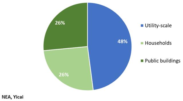大多數(shù)今年安裝的太陽能發(fā)電裝置來自于小型項目,這些項目將太陽能板置于公共建筑和私人住宅的屋頂上。2021年7月,國家能源局要求至少一半的政府辦公樓、40%的學校和醫(yī)院、30%的商業(yè)和工業(yè)建筑,以及20%的農(nóng)村住宅安裝太陽能電池板。