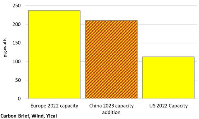 預計中國今年的太陽能發(fā)電量將增加210千兆瓦(圖3),接近美國2022年產(chǎn)能的兩倍,約為歐洲2022年產(chǎn)能的90%。