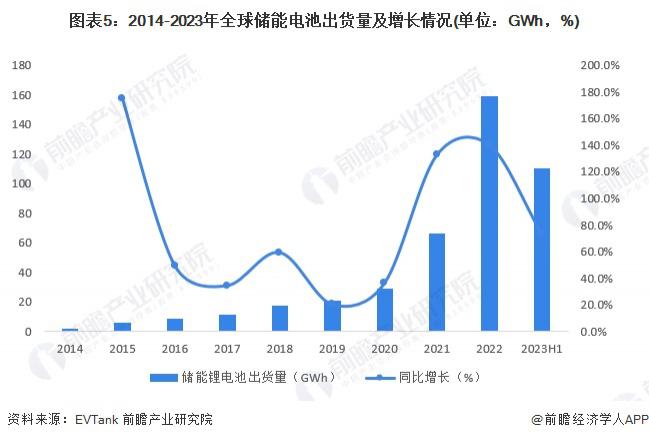 全球電化學(xué)儲能裝機規(guī)模的持續(xù)上漲帶動儲能電池出貨量上漲,根據(jù) EVTank 披露的數(shù)據(jù),2014-2022 年,全球儲能電池 ( 主要為儲能鋰離子電池 ) 出貨量增長速度較快,2022 年,全球儲能鋰離子電池總體出貨量為 159.3GWh,同比增長 140.3%。2023 年上半年,全球儲能電池出貨量達到 110.2GWh,同比增長 73.4%,