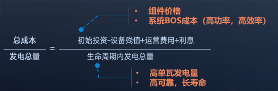 也就是說(shuō),具備“四高”特性的產(chǎn)品,可以從分子、分母兩個(gè)角度入手,降低光伏發(fā)電度電成本。