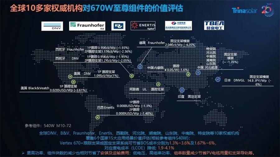 結(jié)果顯示,與市面上一般的540W組件相比,至尊670W組件最多可節(jié)省BOS成本6%,對(duì)應(yīng)度電成本(LCOE)最多可降低4.1%。