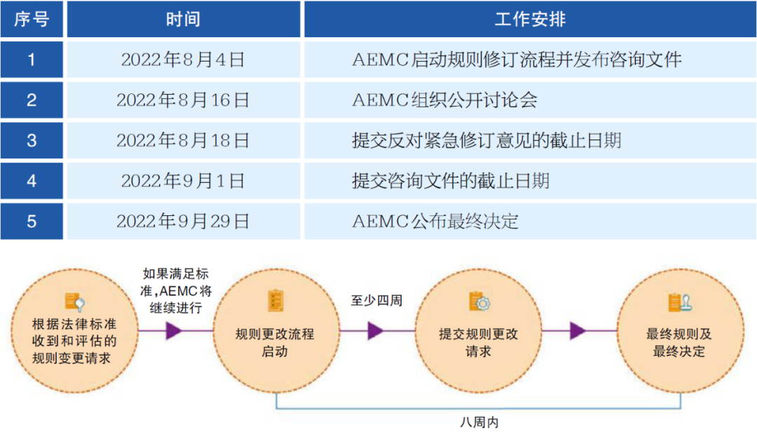 7月21日,AEMC發(fā)布《啟動(dòng)和加快修訂APC規(guī)則修訂意向的預(yù)先通知》。8月4日,AEMC啟動(dòng)了APC規(guī)則緊急修訂流程,公開發(fā)布咨詢文件以便利益相關(guān)者參與其中。按照法律規(guī)定,緊急修訂流程下只有一輪咨詢,并且AEMC必須在規(guī)則修訂流程開始后的八周內(nèi)(最晚9月29日)公布其最終決定。