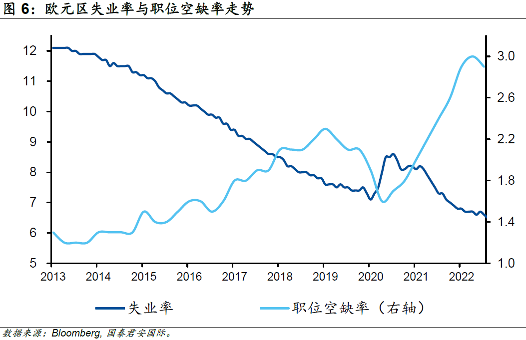 如果說天氣在很大程度上幫助了歐洲人,但歐洲經(jīng)濟(jì)超預(yù)期的根本原因大概率不是因?yàn)樾疫\(yùn)或者天氣。進(jìn)一步來看,勞動(dòng)力市場的火熱意味著經(jīng)濟(jì)維持著較好的動(dòng)能。一方面,即使在能源價(jià)格高企的去年上半年,職位空缺率都處于上行趨勢中;另一方面,在緊張的企業(yè)用工環(huán)境中,歐元區(qū)的失業(yè)率開始走低,并迭創(chuàng)歷史低點(diǎn)。在之前通脹大幅高走的背景下,歐元區(qū)多個(gè)國家的工會(huì)已經(jīng)通過罷工的形式確定了未來的漲薪方案。與此同時(shí),歐洲央行(ECB)基于通脹補(bǔ)償?shù)目紤],在2022年12月的最新預(yù)測中將2022-2024年的累積工資增長較2022年9月的預(yù)測值上調(diào)1.4個(gè)百分點(diǎn)。