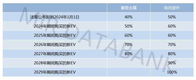 其中電池關(guān)鍵礦物原材料國產(chǎn)率部分規(guī)定:可得到補(bǔ)貼的新能源汽車的電池,其包含的適用關(guān)鍵礦物*中開采、加工或回收于美國及其自貿(mào)伙伴國家*的,需要逐年達(dá)到規(guī)定的百分比,否則該部分補(bǔ)貼不可獲得。電池部件國產(chǎn)率部分規(guī)定:電池中在北美制造或組裝的電池組件占整體電池成本的百分比需要逐年達(dá)到一定規(guī)定的百分比才能達(dá)標(biāo),獲得相應(yīng)部分的補(bǔ)貼。