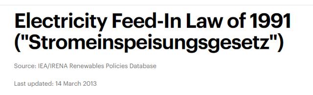 在此之前的1991年,德國(guó)已經(jīng)通過了《上網(wǎng)電價(jià)法(Stromeinspeisungsgesetz)》,推行可再生能源的補(bǔ)貼計(jì)劃。