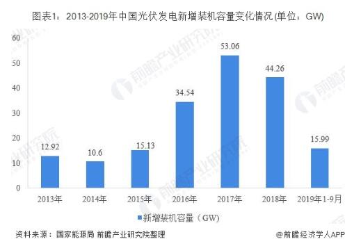 我國(guó)太陽(yáng)能光伏行業(yè)雖起步較晚,但發(fā)展迅速,尤其是2013年以來(lái),在國(guó)家及各地區(qū)的政策驅(qū)動(dòng)下,太陽(yáng)能光伏發(fā)電在我國(guó)呈現(xiàn)爆發(fā)式增長(zhǎng),據(jù)國(guó)家能源局統(tǒng)計(jì)數(shù)據(jù)顯示,2017年,我國(guó)光伏發(fā)電新增裝機(jī)容量為53.06GW,創(chuàng)歷史新高,2018年,受光伏531新政影響,各地光伏發(fā)電新增項(xiàng)目有所下滑,全年新增裝機(jī)容量為44.26GW,同比下降16.6%。截至2019年9月底,全國(guó)光伏發(fā)電新增裝機(jī)15.99GW。