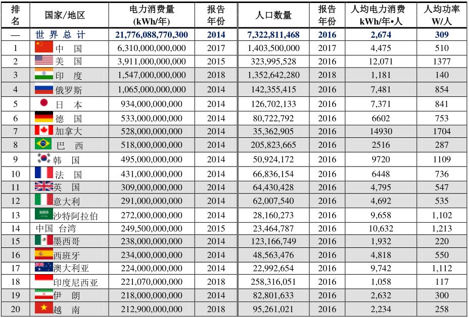 電力消費最高的20個國家