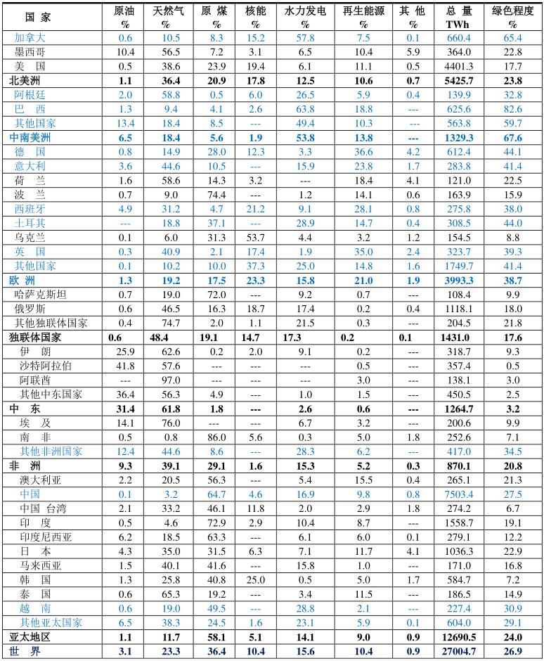 本資料根據(jù)BP 2020年報告的數(shù)據(jù),再經(jīng)過計算而成。本文所指的化石燃料是原油、天然氣和原煤構(gòu)成;非再生能源由化石燃料和核燃料構(gòu)成。綠色能源由水力發(fā)電、再生能源和“其他”構(gòu)成。“其他”指抽水蓄能、城市廢物發(fā)電等。綠色程度為水力發(fā)電、再生能源和“其他”的水力發(fā)電、再生能源和“其他”的%之和,用%表示。表中藍色表示這些國家綠色程度超過了世界平均值26.9%。