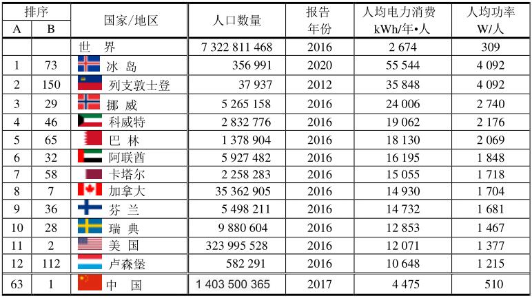 表中:A—表示人均能源和電力消費最多的排序;B—表示該國電力產(chǎn)量的世界排序。