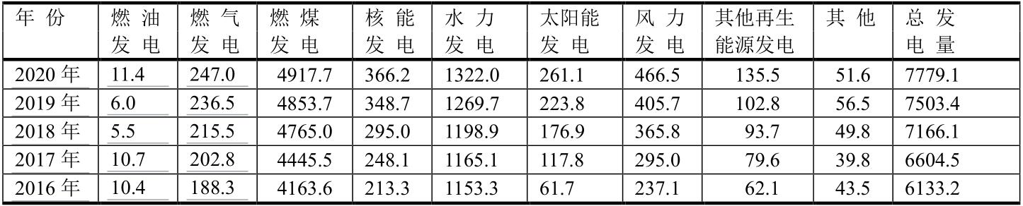 就中國(guó)發(fā)電而論,2020年燃煤發(fā)電居首位,占中國(guó)發(fā)電總量的4917.7/7779.1=63.2%;其次為水力發(fā)電、風(fēng)力發(fā)電、核能發(fā)電和太陽(yáng)能發(fā)電。盡管中國(guó)燃?xì)獍l(fā)電量居世界第三位,但在中國(guó)發(fā)電總量中居第六位247.0/7779.1=3.2%。