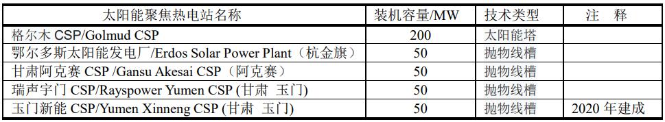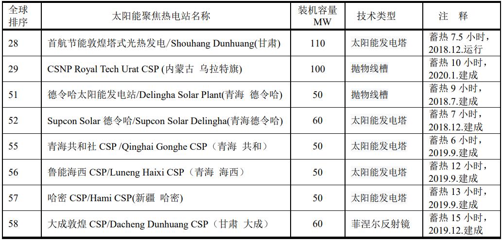 全球在建的裝機容量至少在50MW的太陽能聚焦熱電站有7座,其中中國有6座。最大的是在阿聯(lián)酋迪拜—穆罕默德·本·拉希德·阿勒馬克圖姆太陽能公園四期(Mohammed bin Rashid Al Maktoum Solar Park Phase IV),估計2021年竣工。中國在建的CSP如表。