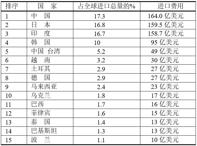 2020年原煤的國際貿(mào)易量為12.46億噸。煤進(jìn)口前15位國家和地區(qū)的數(shù)量約占全球總量的86.3%,為10.75億噸。其中最大的煤進(jìn)口國是中國,占全球總量的17.3%,其次是日本(16.8%)和印度(16.7%)。