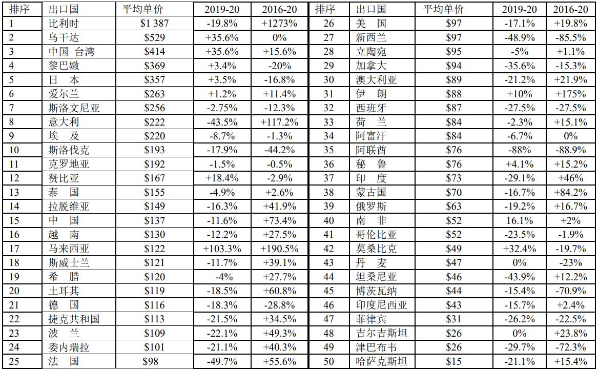 2019年至2020年,平均單價(jià)增長最快的國家是馬來西亞(增長103.3%)、烏干達(dá)(增長35.6%)、莫桑比克(增長32.4%)、贊比亞(增長18.4%)和伊朗(增長10%)。