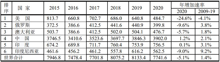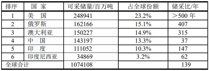 2020年全球原煤可采儲(chǔ)量前6位的國家