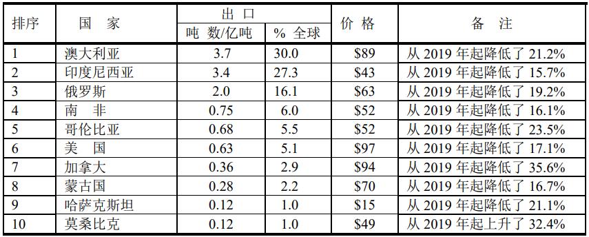 2020年煤出口前10位國家的狀況