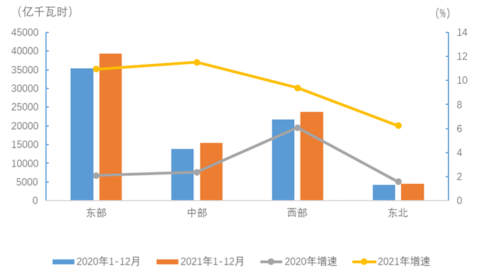 1-12月,東、中、西部和東北地區(qū)③全社會用電量分別為39366、15459、23795和4508億千瓦時,增速分別為11.0%、11.5%、9.4%和6.2%。