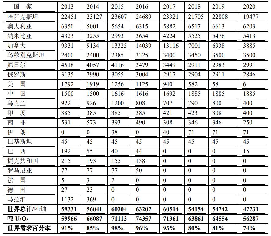 2020年世界上最大的鈾生產(chǎn)國仍然是哈薩克斯坦(占世界總產(chǎn)量的19477/47731=40.8%)、澳大利亞(6203/47731=13.0%)和納米比亞(5413/47731=12.0%)等這3個(gè)國家占全球總產(chǎn)量的65.8%;其他還有加拿大(8.1%)、烏茲別克斯坦(7.3%)、尼日爾(6.3%)和俄羅斯(6.0%)。